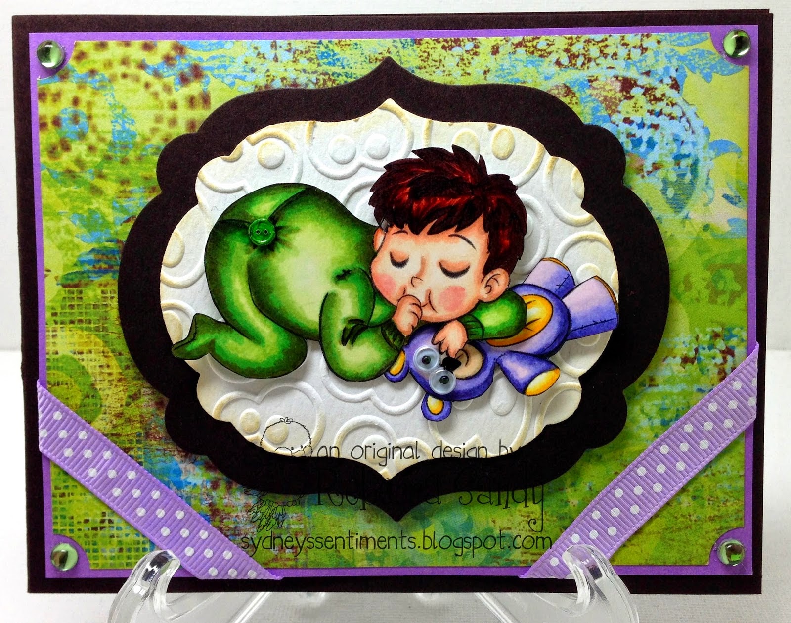 I have used my Copics to color him up and then added a little button brad for his jammies. Here is the rest of the recipe.